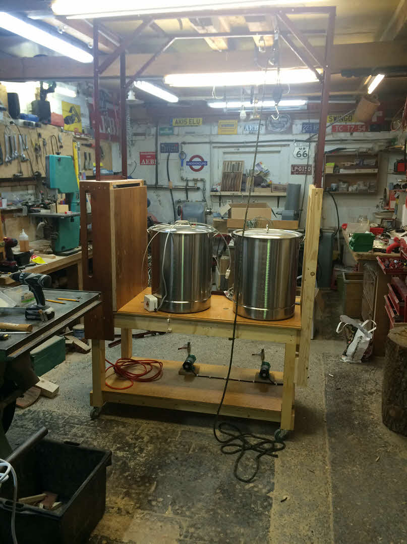 I put the control panel and pots on a rolling brewery cart I built from some old wood I had in the barn.